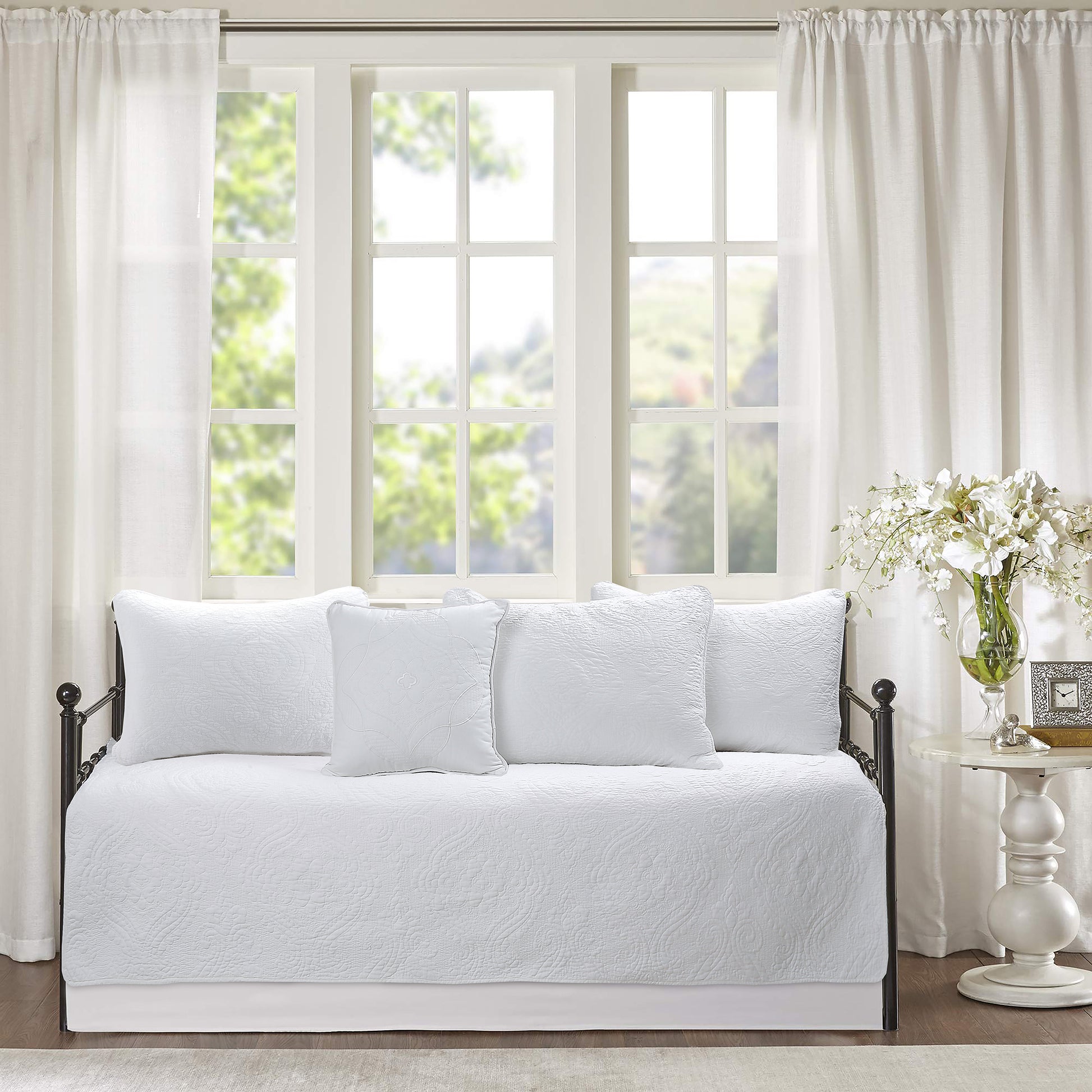 - Day Bed Set includes: 1 quilt, 3 standard shams, 1 bed skirt, and 1 square decor throw pillow (fits a twin and has tailored corners)