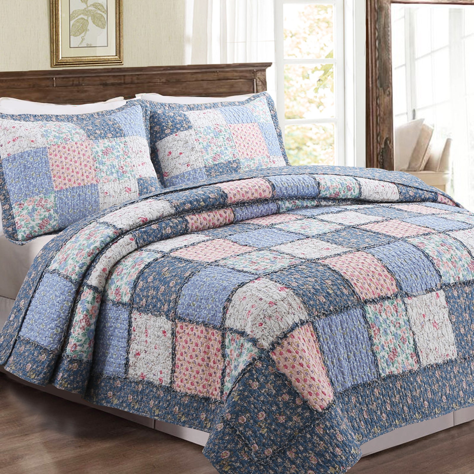 Mraz Blue Pink Ruffle Real Patchwork Cotton 3-Piece Reversible Quilt Bedding Set