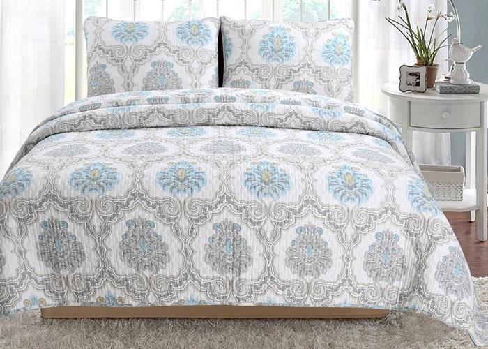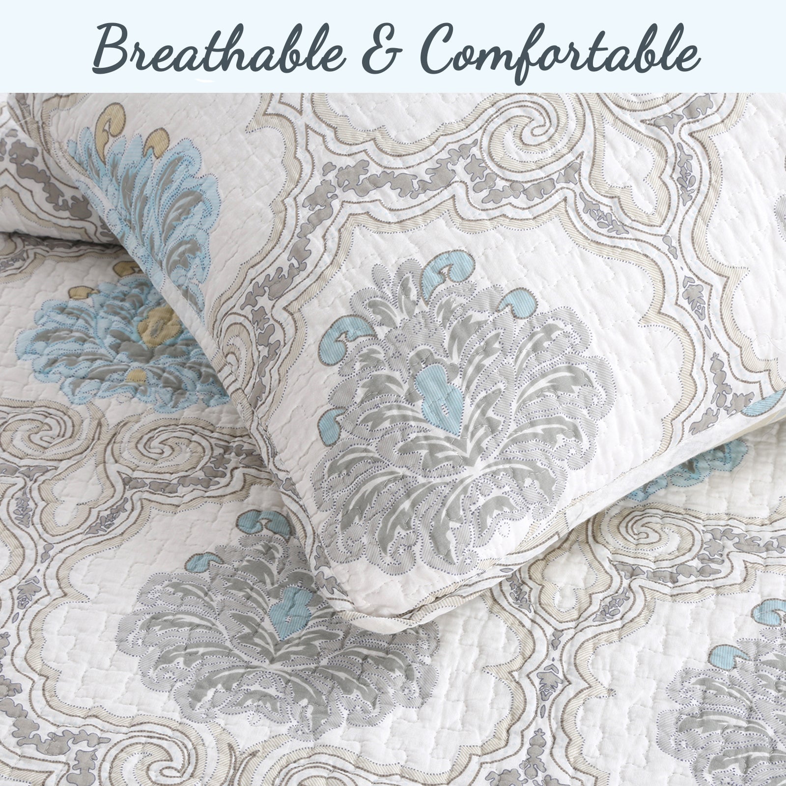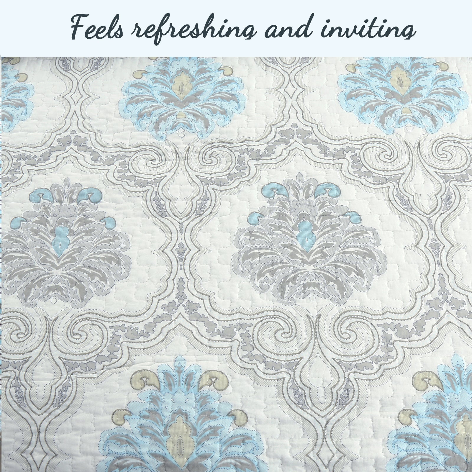 Blue Floral Medallion Cotton 3-Piece Reversible Quilt Bedding Set