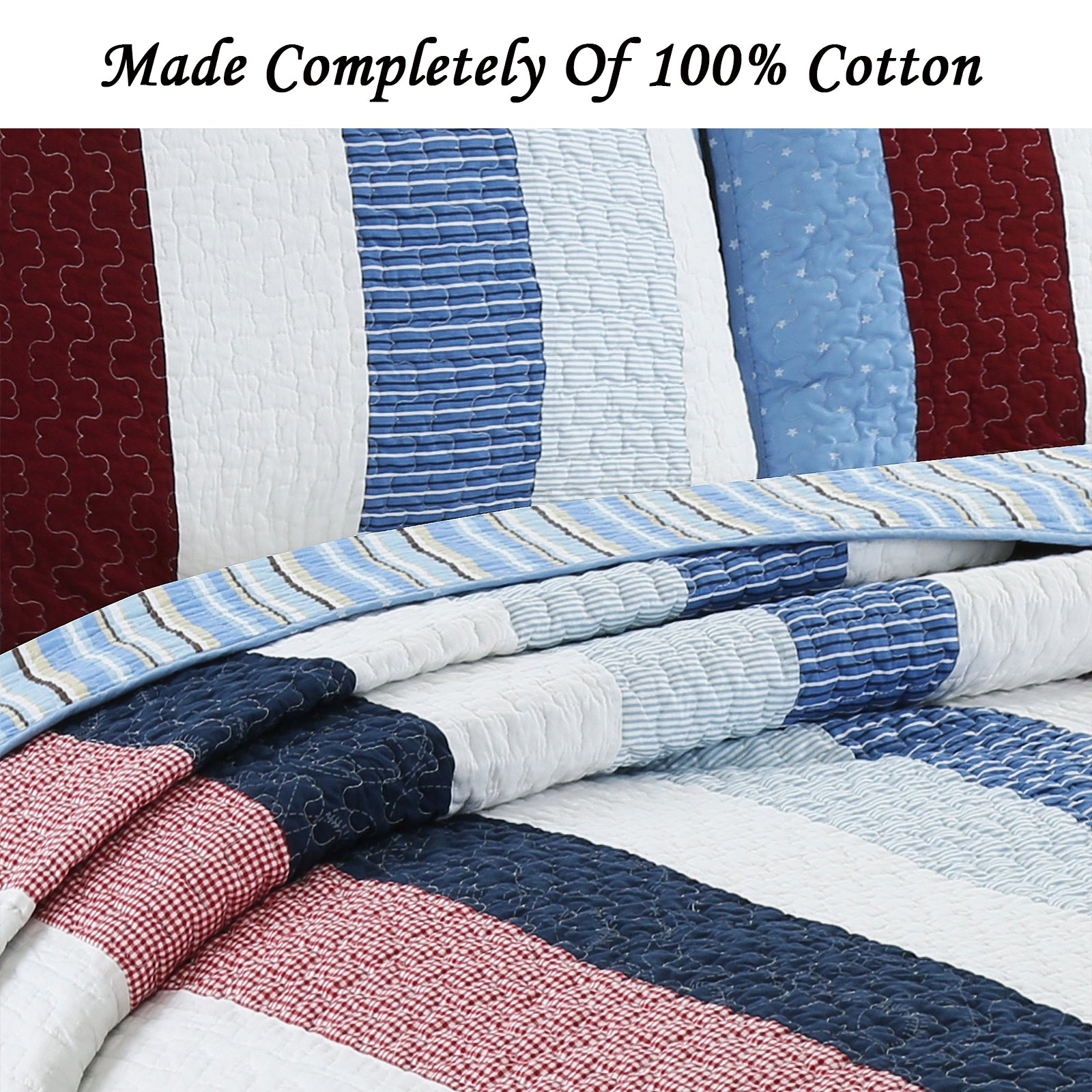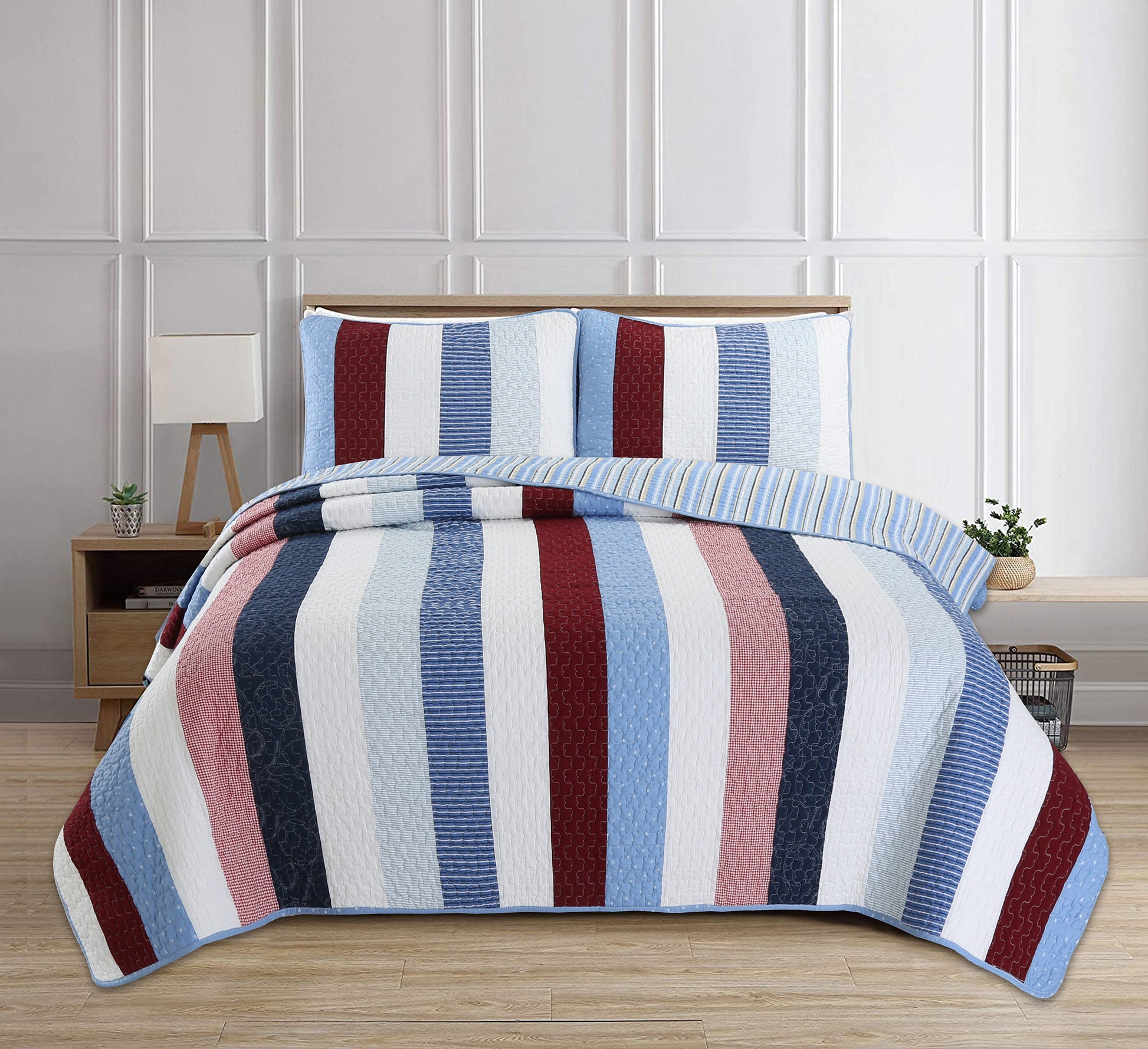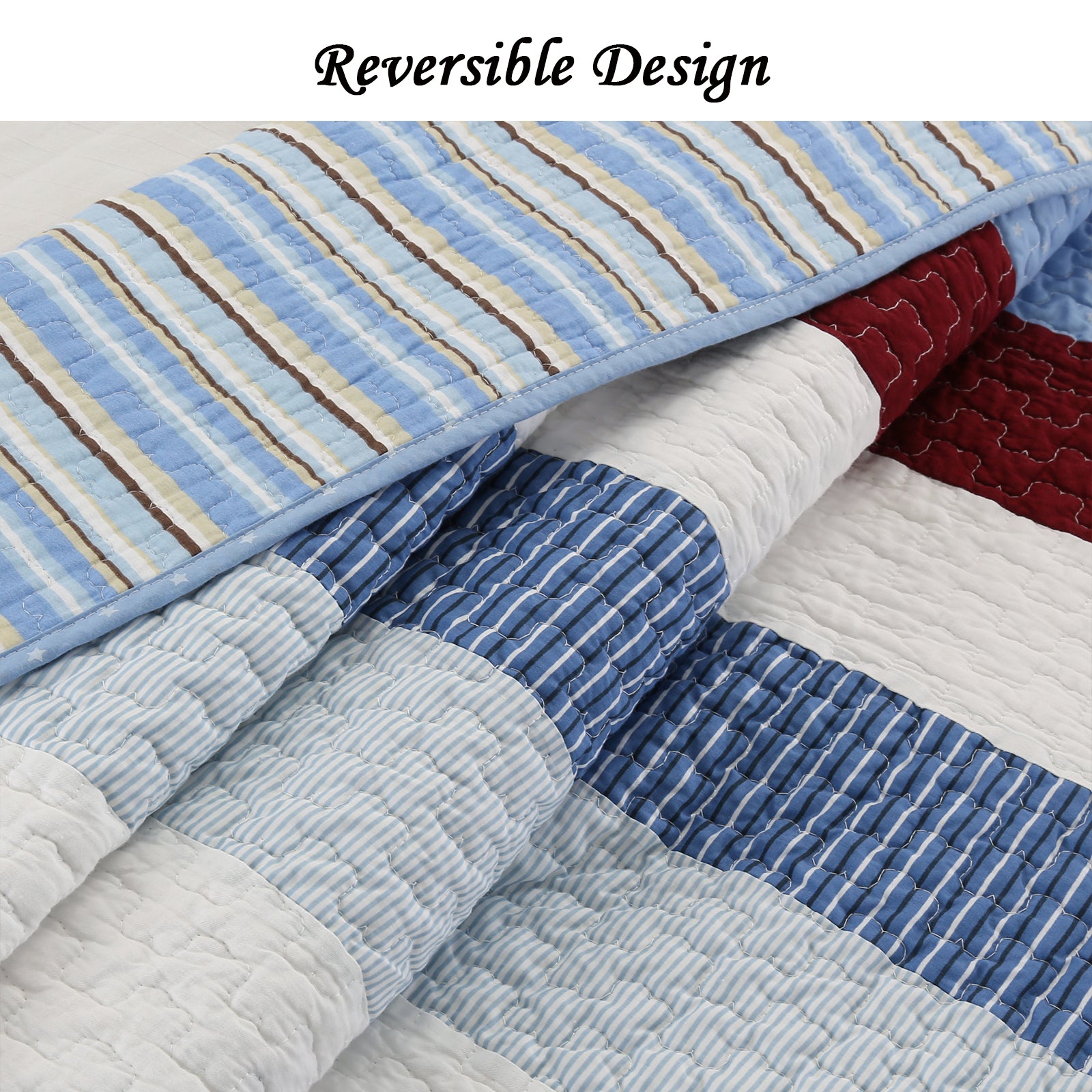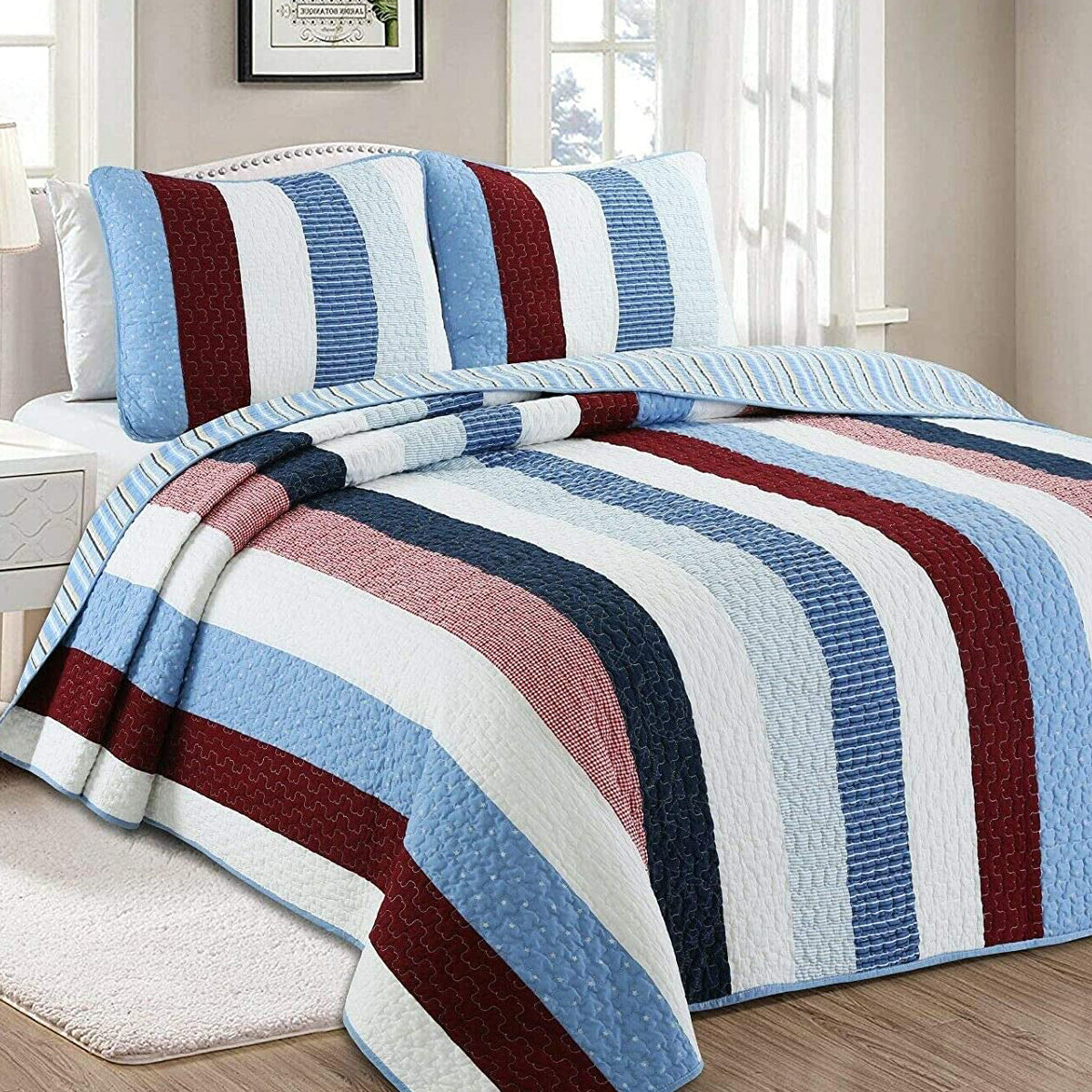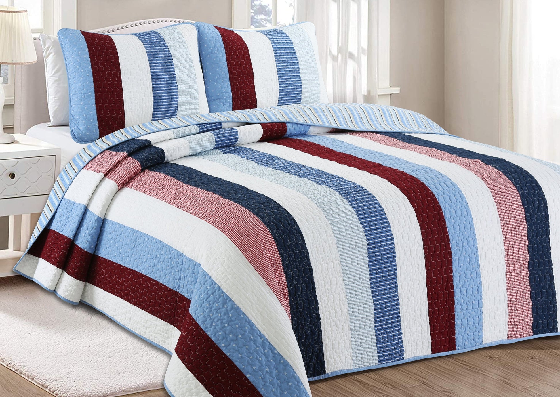 Blue Red White Striped Cotton Reversible Quilt Bedding Set
