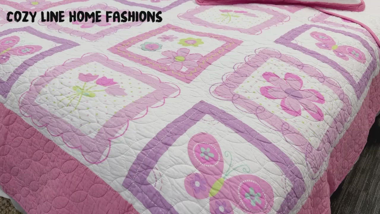Butterfly Flower Pink Print Patchwork Twin Cotton Reversible Quilt Bedding Set