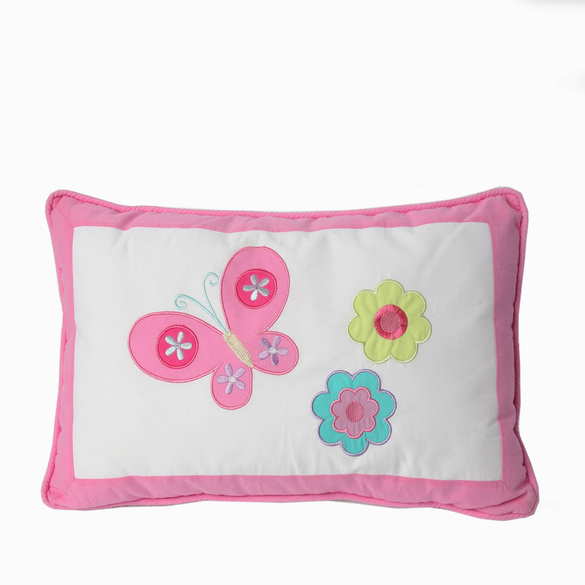 - This butterfly décor throw pillow will add the perfect finishing touch to your room. In pink, purple, blue, yellow, and white with beautiful embroidered outlines and many detailed accents. The butterfly’s wings have adorable little embroidered flowers. This décor throw pillow will complete the rooms look and add the needed designer’s touch. This pillow is of a butterfly shape and measures approximately 18”x12”x3” inches. This butterfly décor throw pillow is crafted of 100% Cotton. With its easy-care machine-washable cotton material, this butterfly décor throw pillow is easy and quick to launder.