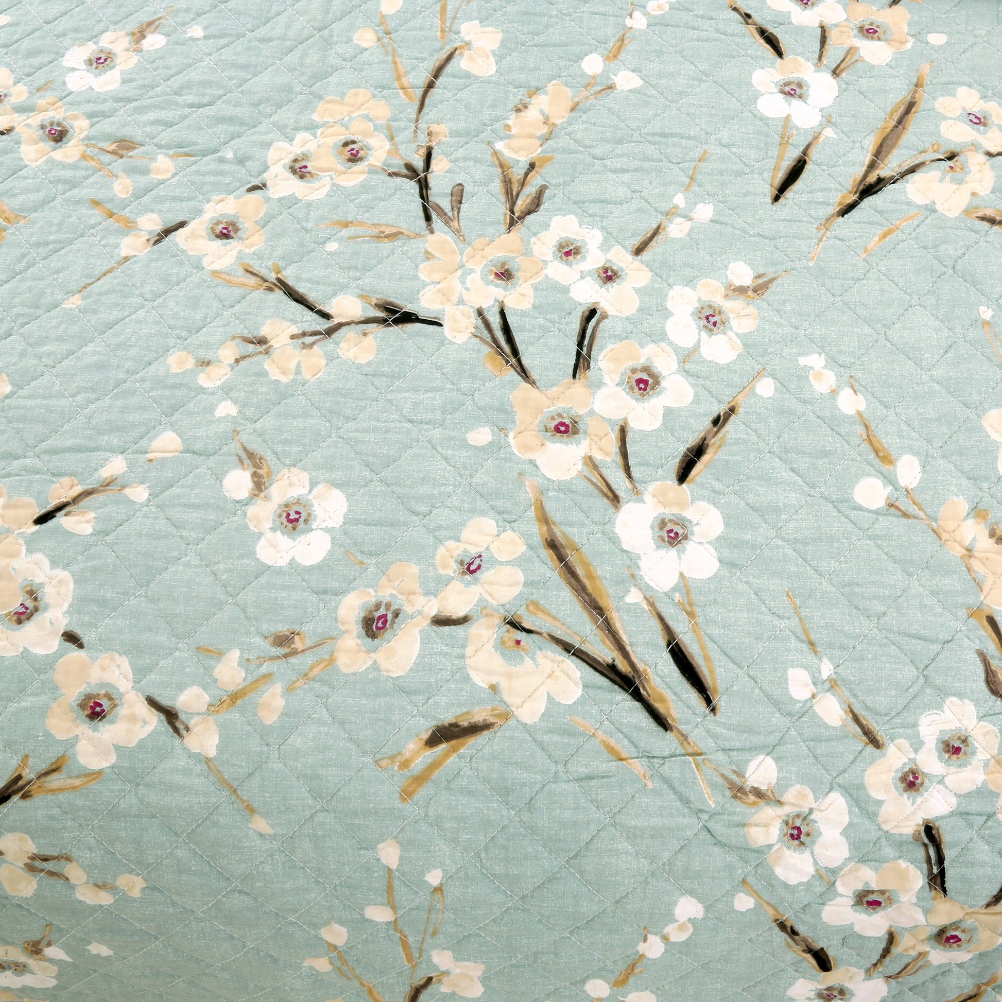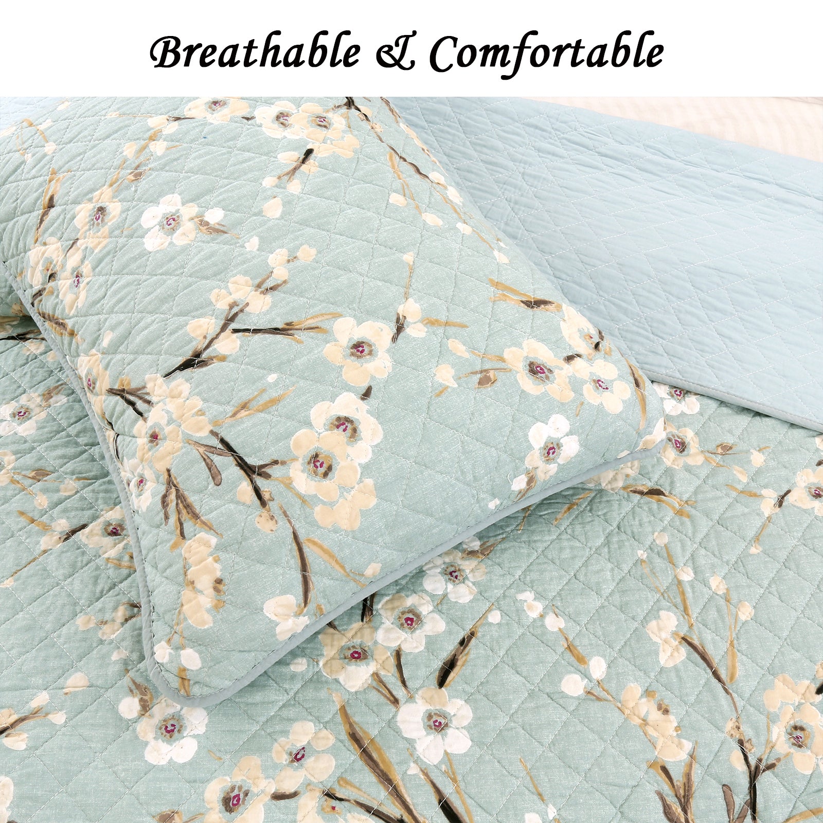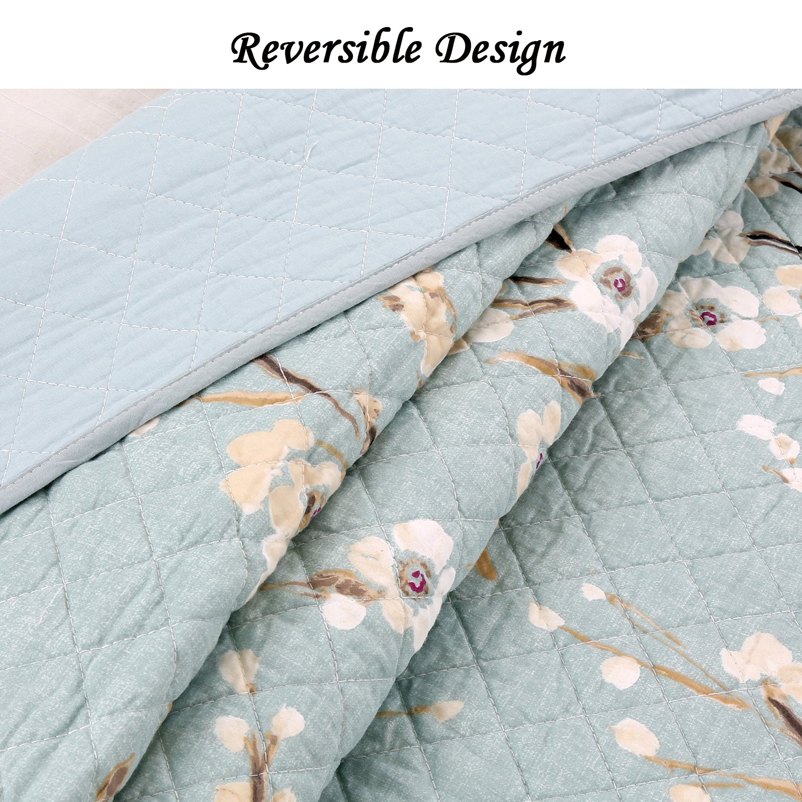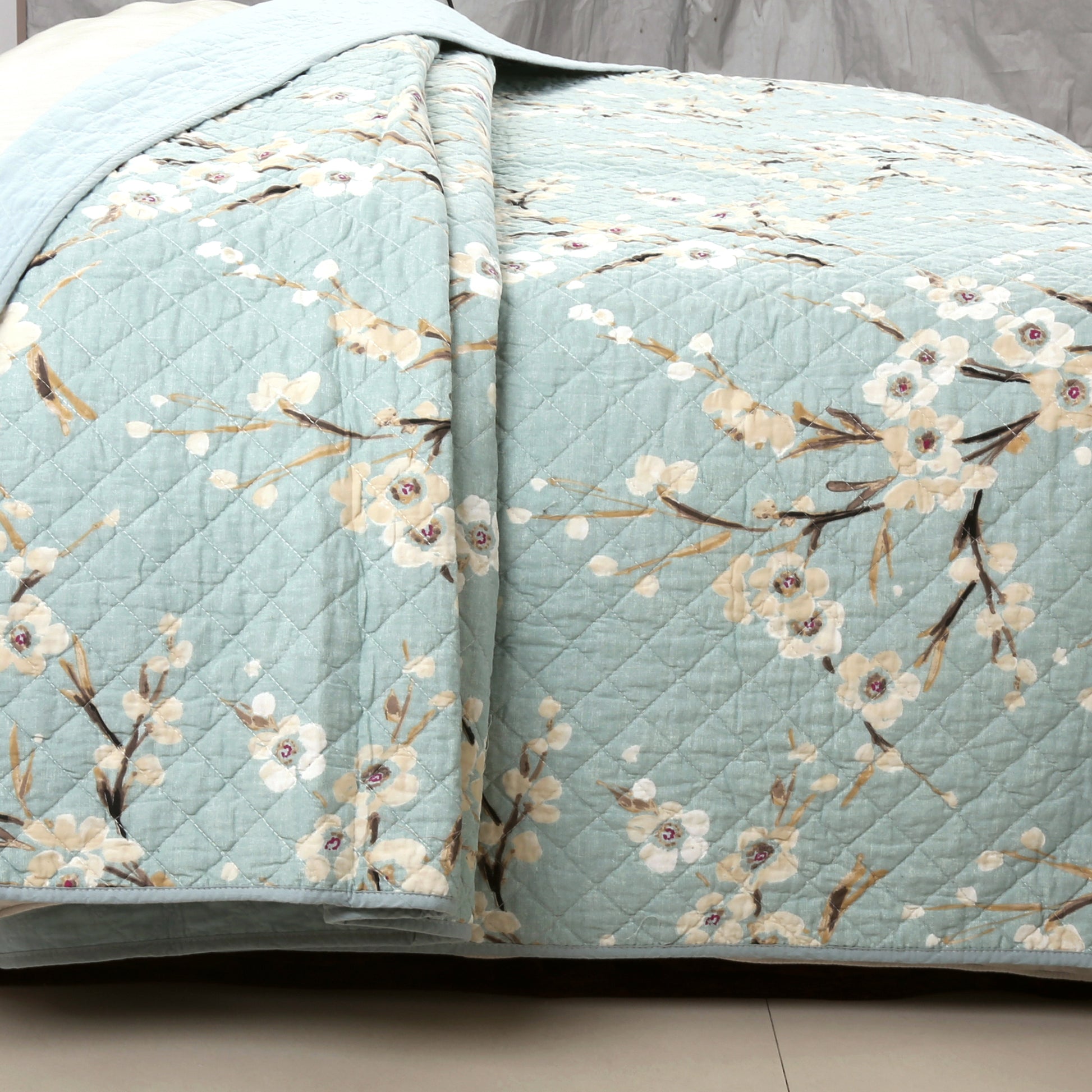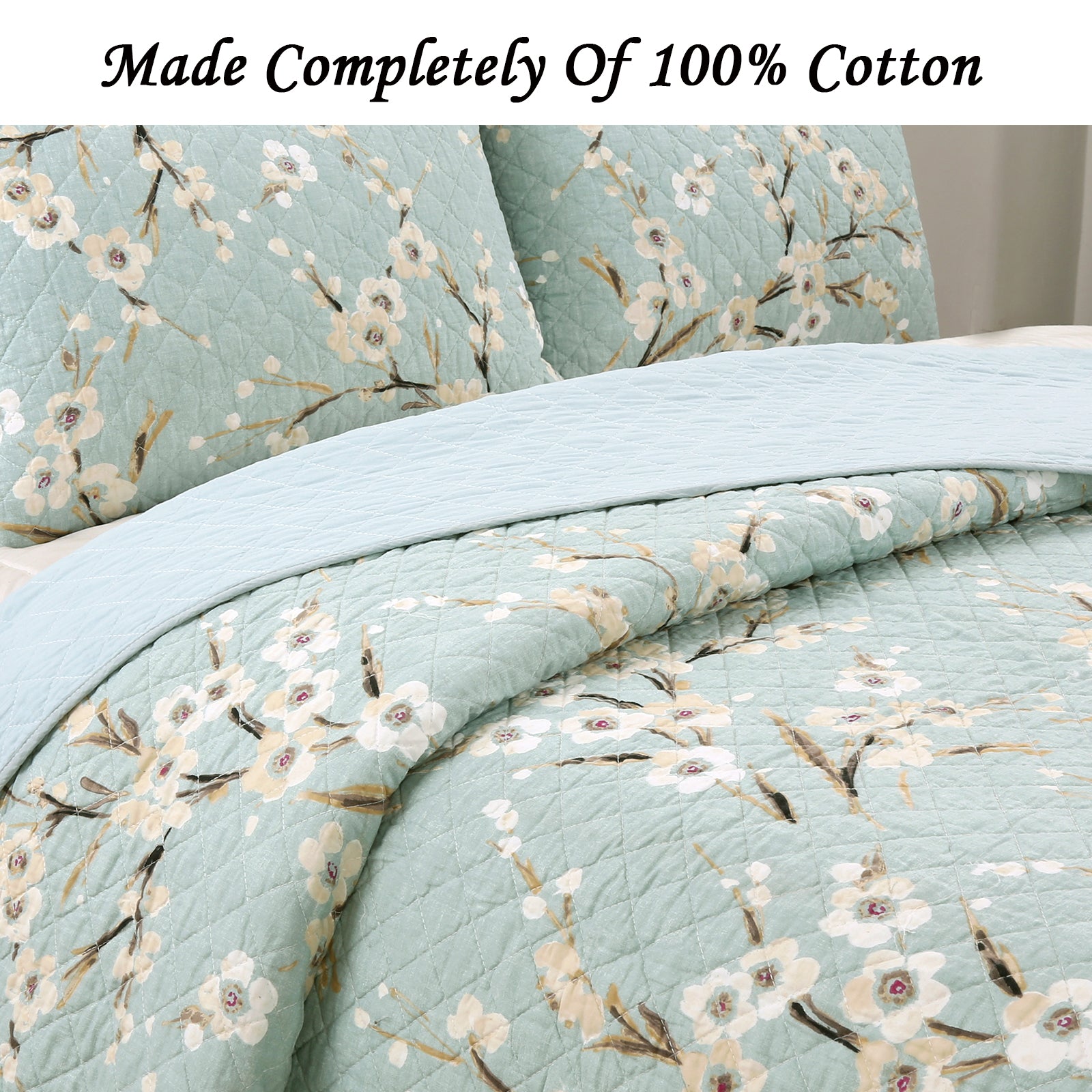 Cream Cherry Blossom Floral Cyan Blue Green 3-Piece Reversible Quilt Bedding Set