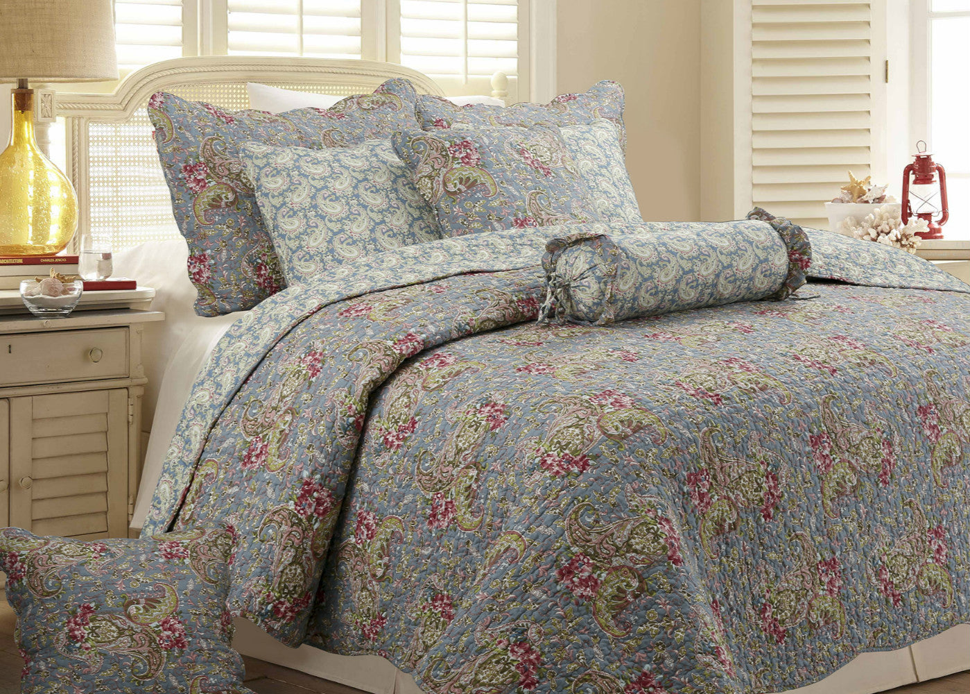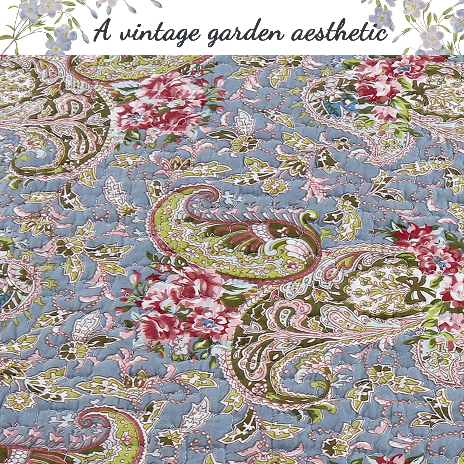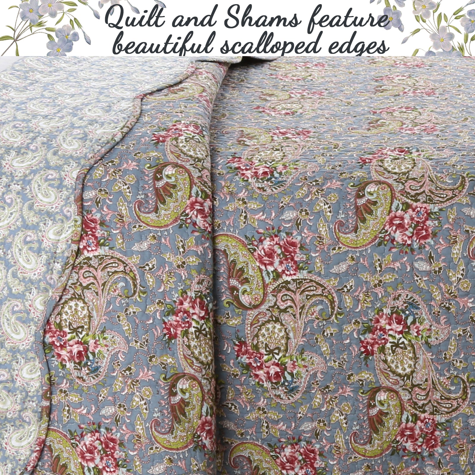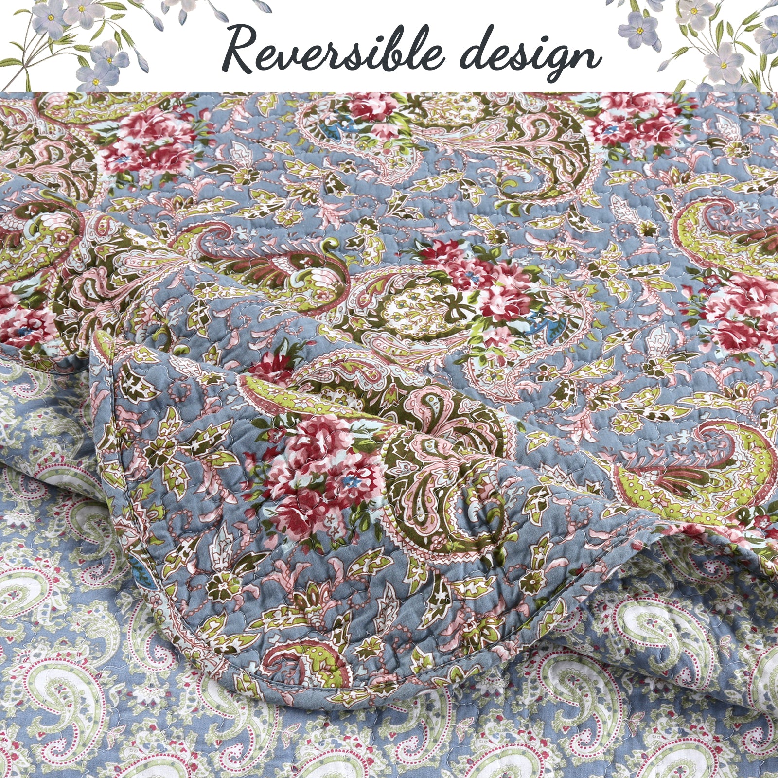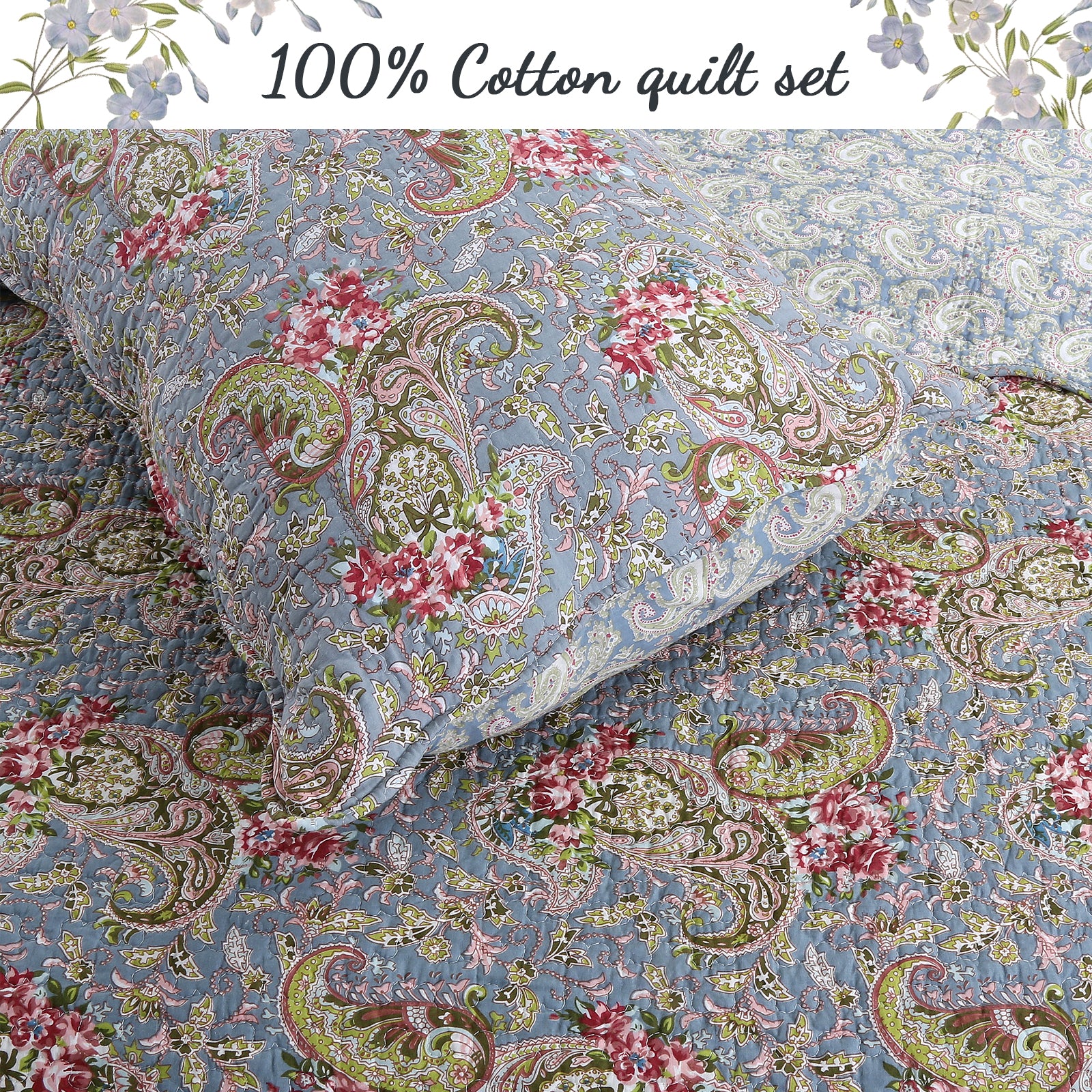 Floral Paisley Blue Cotton 3-Piece Reversible Quilt Bedding Set