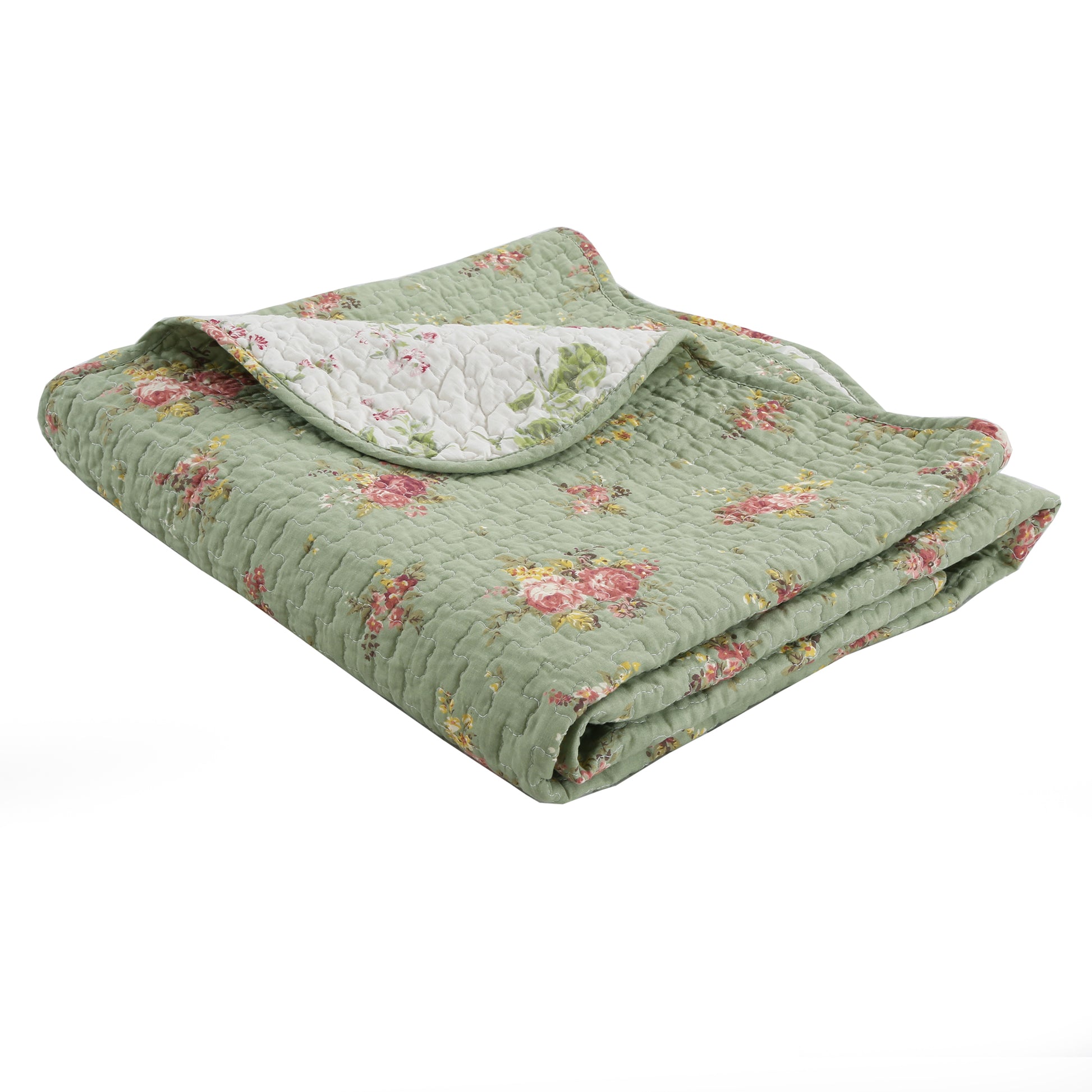 Green Floral Scalloped Edge Cotton Reversible Quilted Throw Blanket