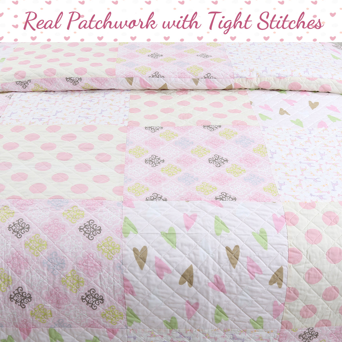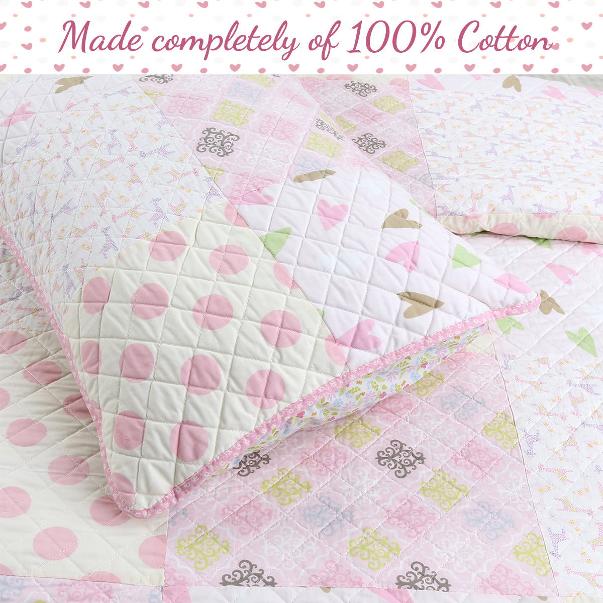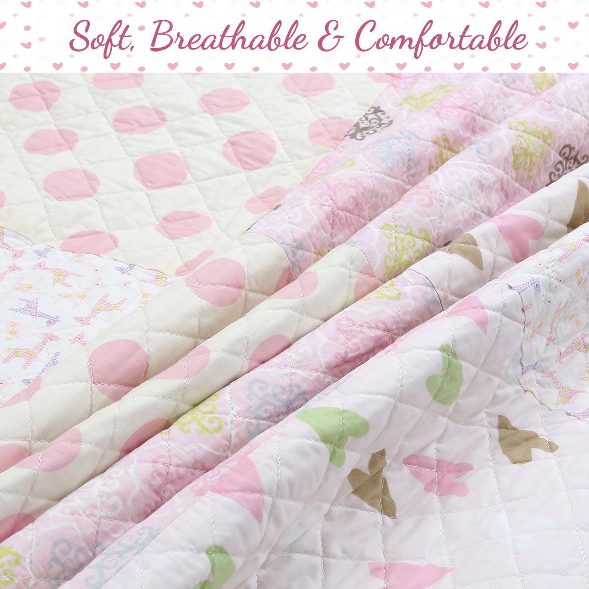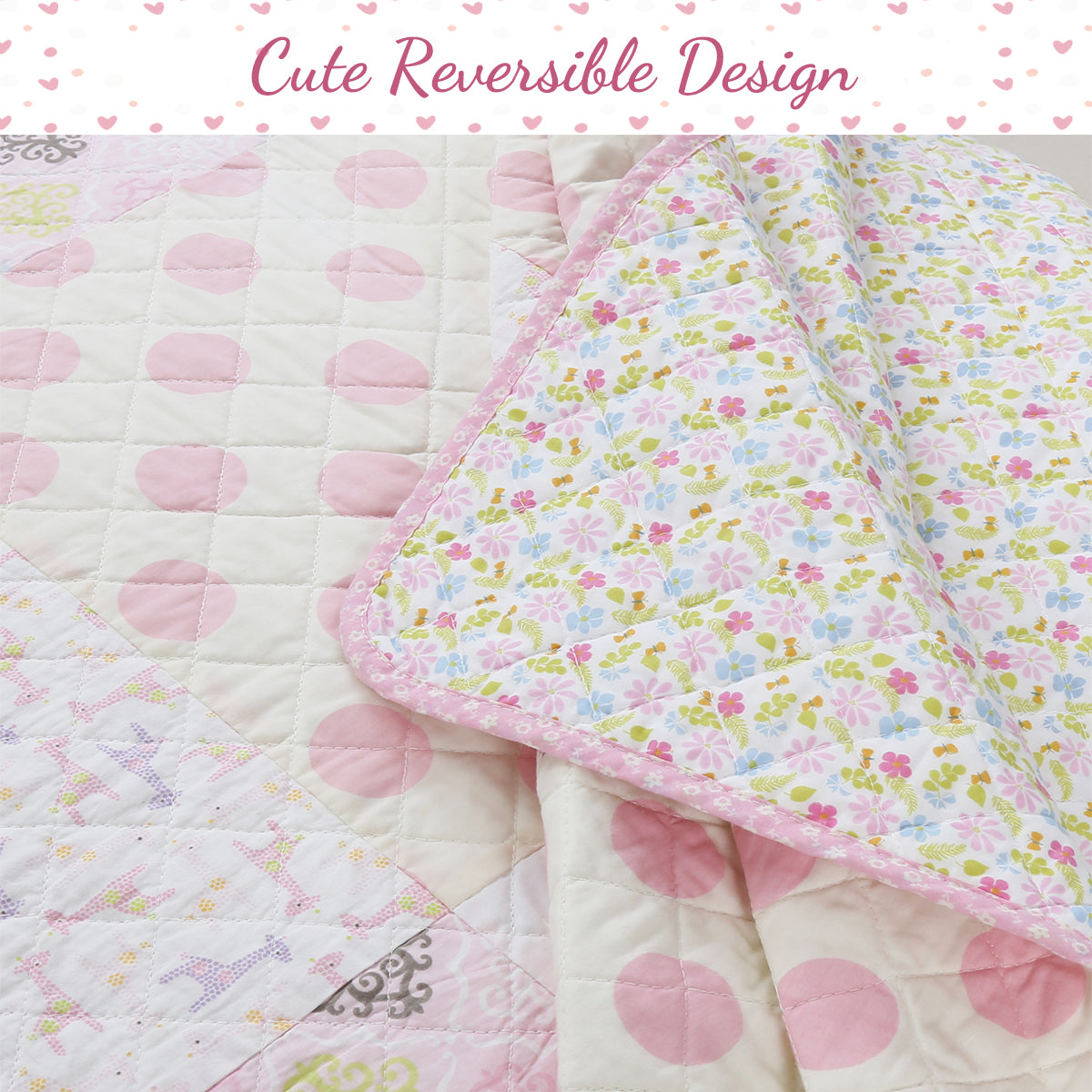 Pink Heart Floral Dot Giraffe Medallion Real Patchwork Cotton Reversible Quilt Bedding Set