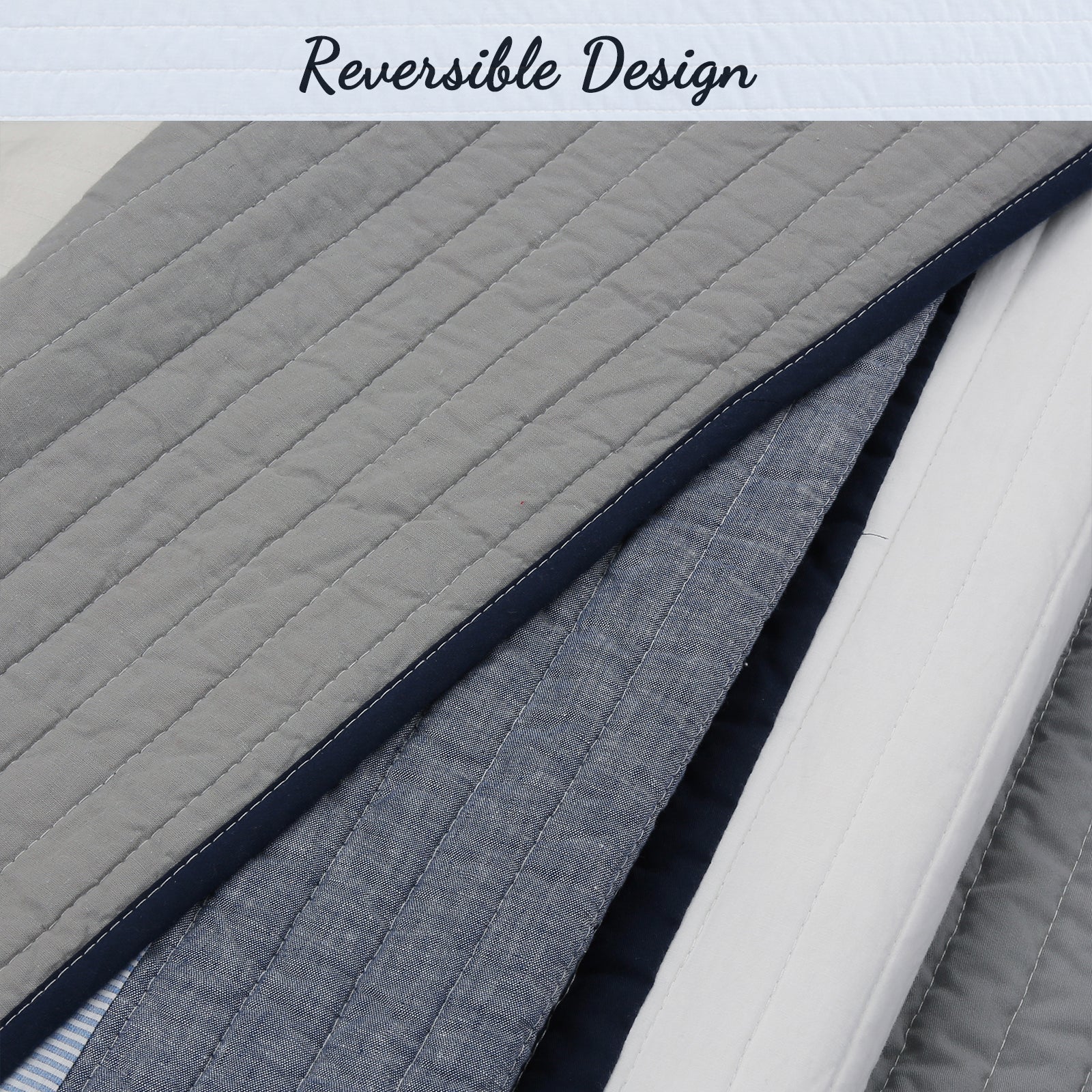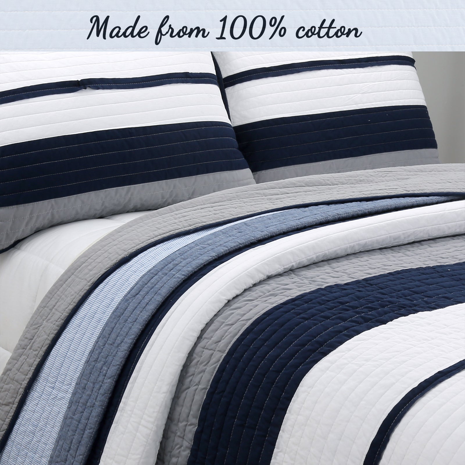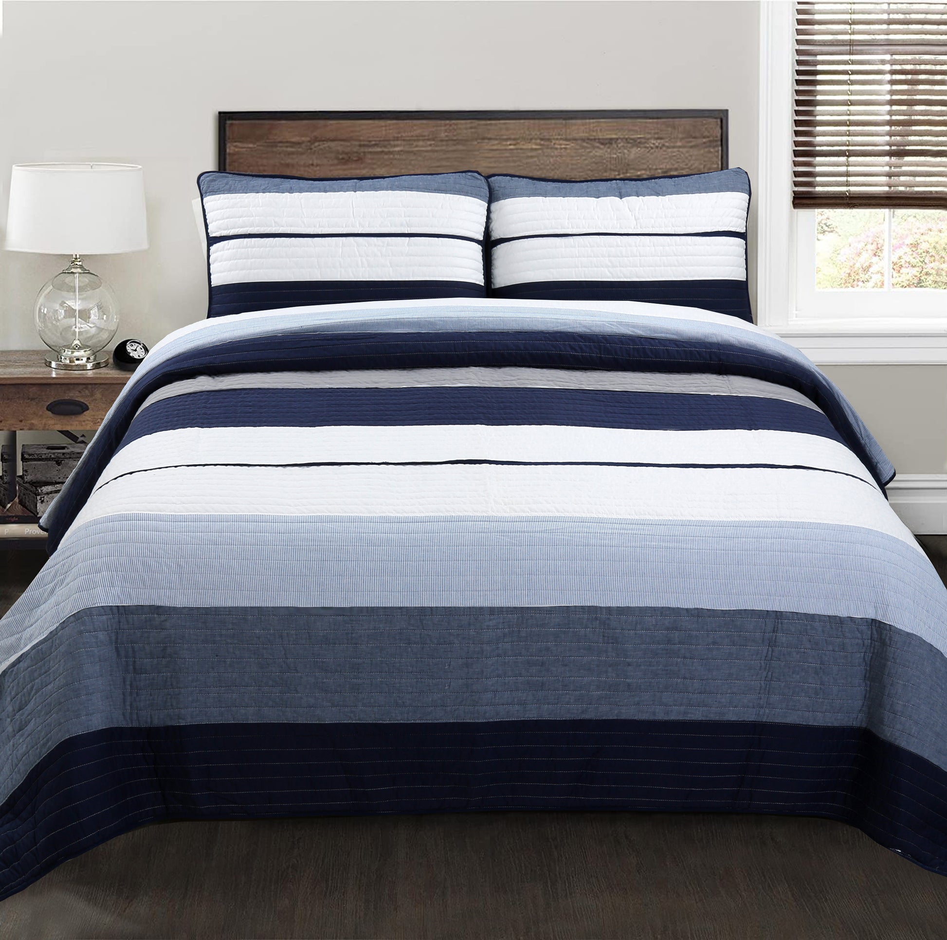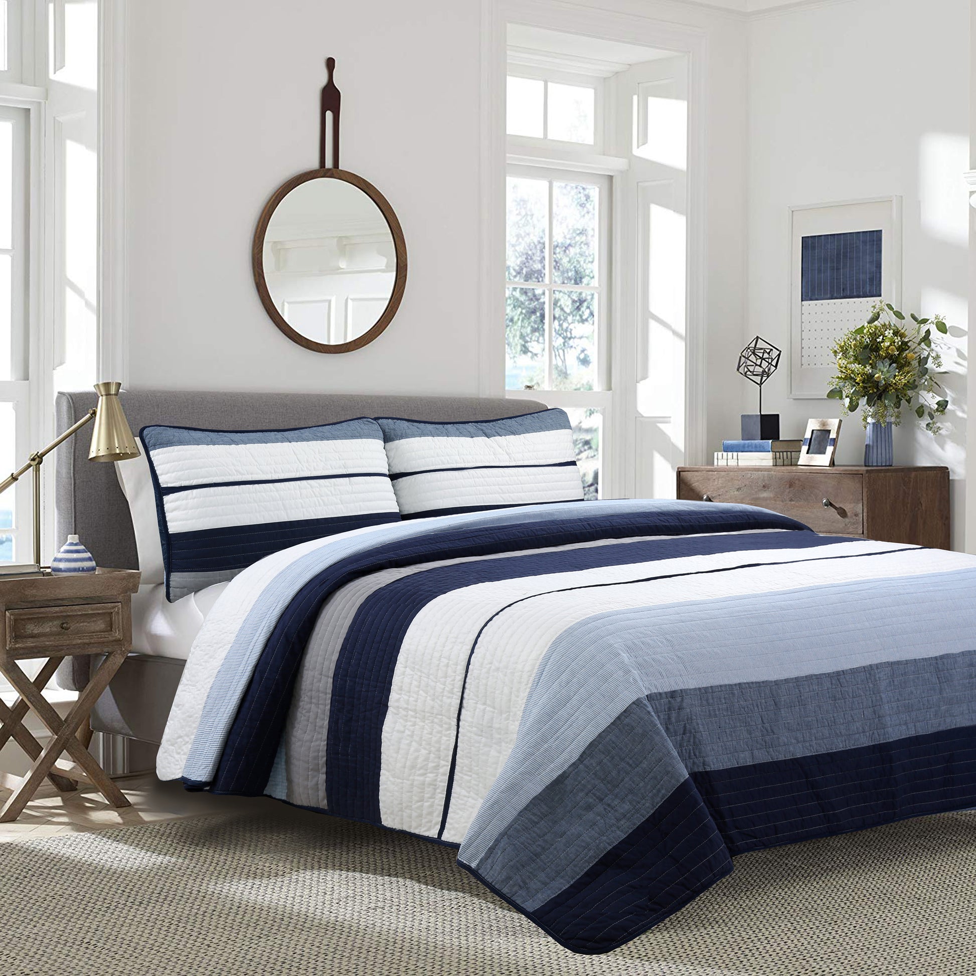 Tranquil Blue Gray Stripe Real Patchwork Cotton Reversible Quilt Bedding Set