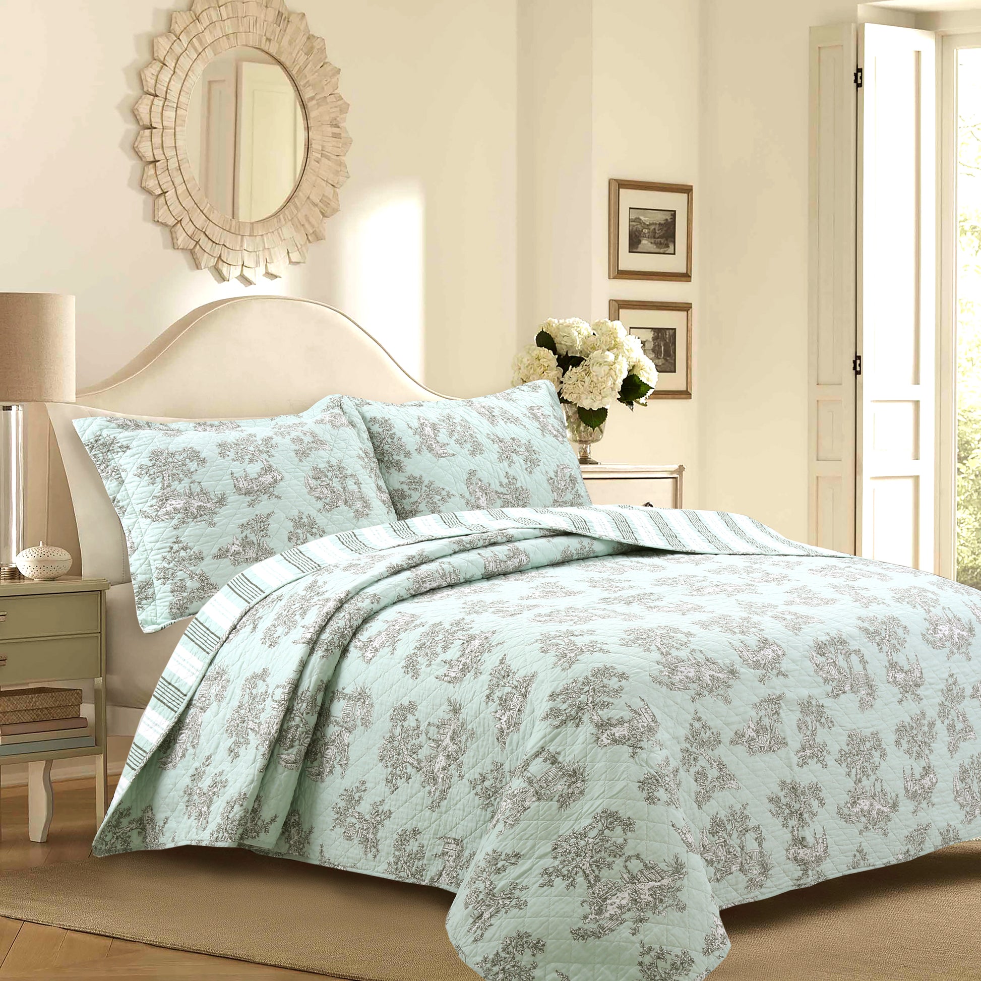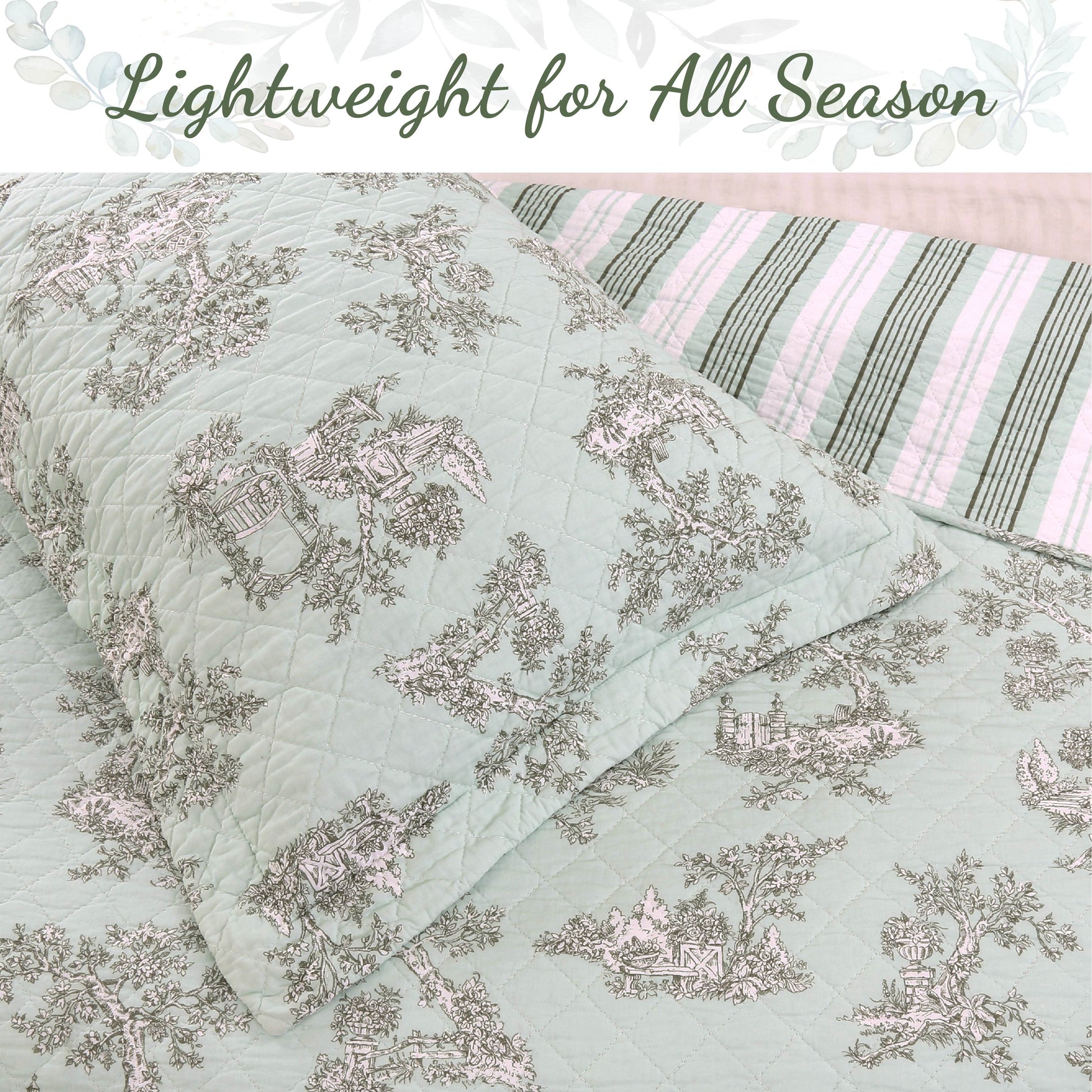 Cottage Garden Floral Toile Mint Green 3-Piece Cotton Reversible Quilt Bedding Set